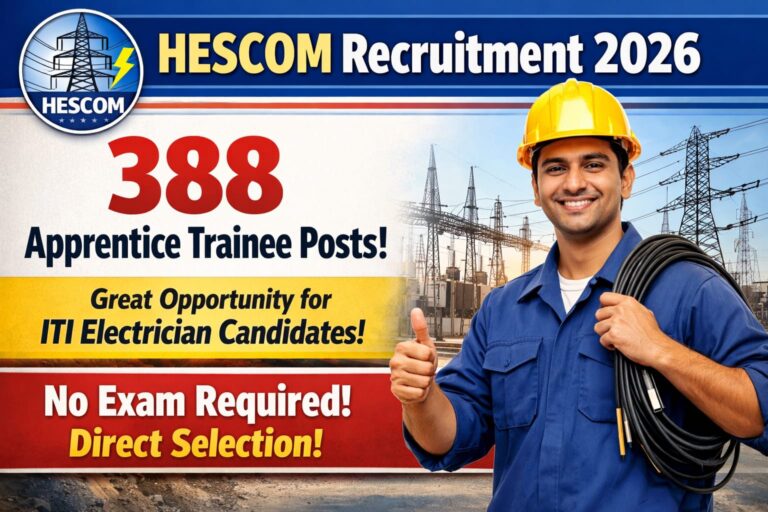 HESCOM Recruitment 2026: ITI ಎಲೆಕ್ಟ್ರಿಷಿಯನ್ ಅಭ್ಯರ್ಥಿಗಳಿಗೆ ದೊಡ್ಡ ಅವಕಾಶ – 388 ಟ್ರೈನಿ ಹುದ್ದೆಗಳಿಗೆ ಅರ್ಜಿ ಆರಂಭ! ಕರ್ನಾಟಕದಲ್ಲಿ ಸರ್ಕಾರಿ ಉದ್ಯೋಗಕ್ಕಾಗಿ ಕಾಯುತ್ತಿರುವ ಸಾವಿರಾರು ಯುವಕರಿಗೆ …