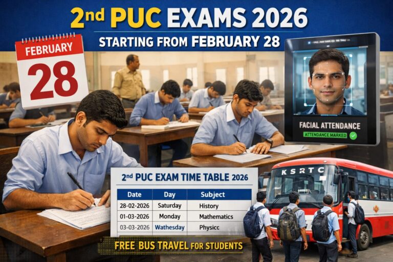ಫೆಬ್ರವರಿ 28ರಿಂದ 2ನೇ ಪಿಯುಸಿ ಪರೀಕ್ಷೆ 2026 ಆರಂಭ: 7.1 ಲಕ್ಷ ವಿದ್ಯಾರ್ಥಿಗಳು ಹಾಜರು – ಸಂಪೂರ್ಣ ಟೈಂ ಟೇಬಲ್, ಉಚಿತ ಬಸ್ ಪ್ರಯಾಣ ಹಾಗೂ ಹೊಸ ಫೇಷಿಯಲ್ ಅಟೆಂಡೆನ್ಸ್ ನಿಯಮ