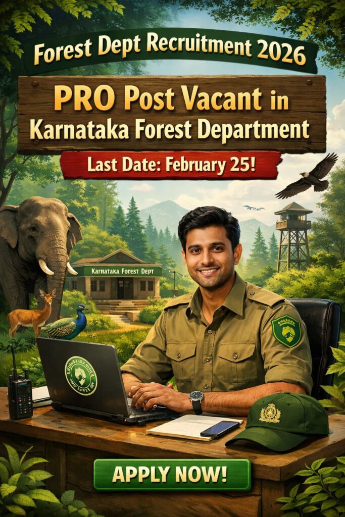 Forest Dept Recruitment 2026: PRO ಹುದ್ದೆಗೆ ಅರ್ಜಿ ಆಹ್ವಾನ ಕರ್ನಾಟಕದಲ್ಲಿ ಸರ್ಕಾರಿ ಉದ್ಯೋಗಕ್ಕಾಗಿ ಕಾಯುತ್ತಿರುವ ಅಭ್ಯರ್ಥಿಗಳಿಗೆ ಸುವರ್ಣಾವಕಾಶ ಬಂದಿದೆ. Karnataka Forest Department ವತಿಯಿಂದ 2026ನೇ …