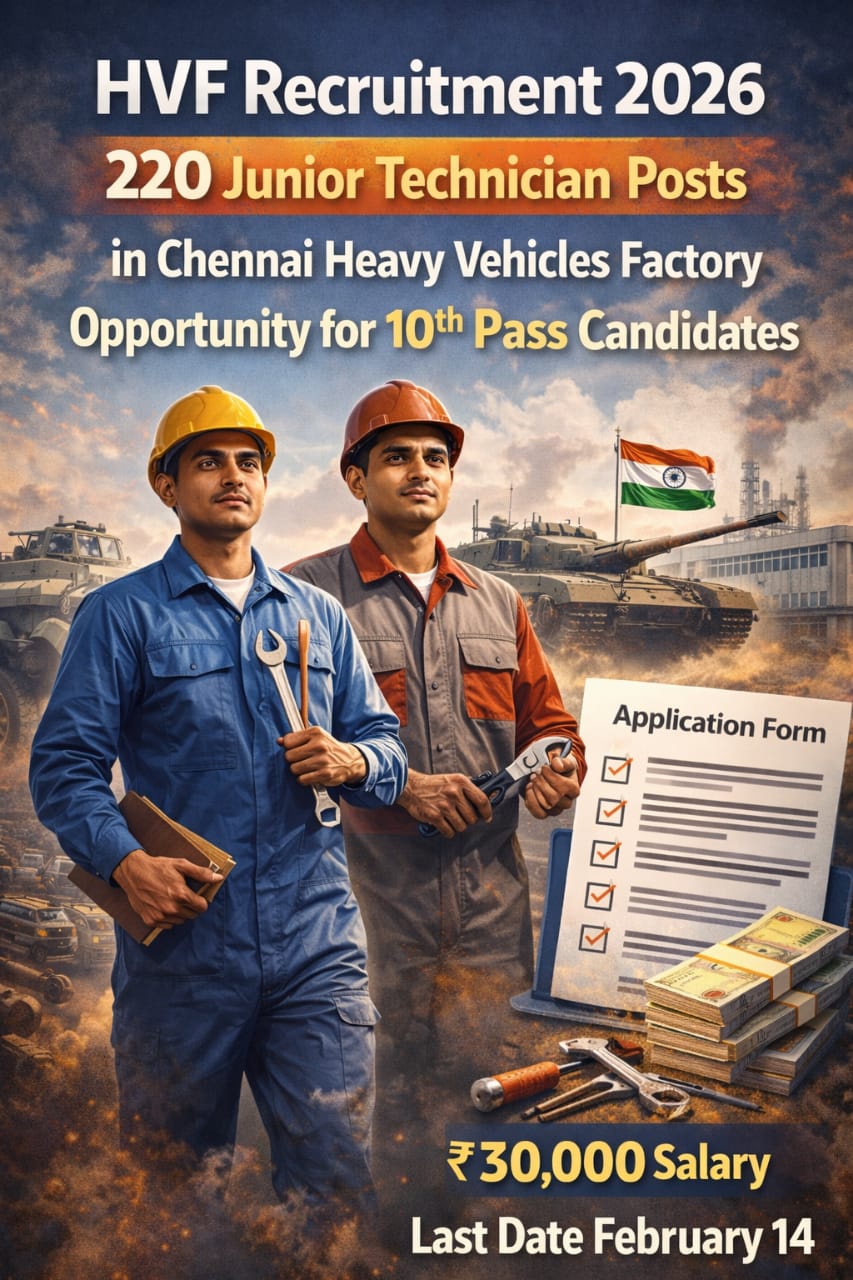 HVF Recruitment 2026: 10ನೇ ಪಾಸ್ ಅಭ್ಯರ್ಥಿಗಳಿಗೆ ರಕ್ಷಣಾ ಕ್ಷೇತ್ರದಲ್ಲಿ ಉದ್ಯೋಗ – 220 ಜೂನಿಯರ್ ಟೆಕ್ನಿಷಿಯನ್ ಹುದ್ದೆಗಳ ಭರ್ಜರಿ ನೇಮಕಾತಿ