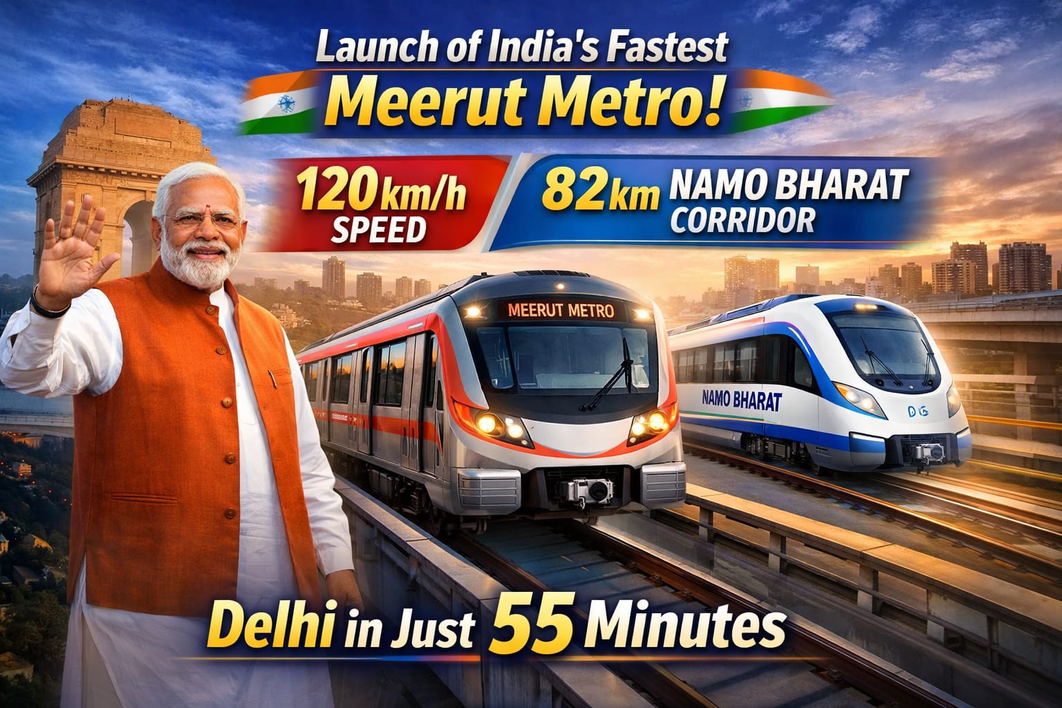 120 ಕಿಮೀ ವೇಗದ ಮೀರತ್ ಮೆಟ್ರೋ ಮತ್ತು 82 ಕಿಮೀ ನಮೋ ಭಾರತ್ ಕಾರಿಡಾರ್ ಉದ್ಘಾಟನೆ. ದೆಹಲಿ–ಮೀರತ್ ಪ್ರಯಾಣ ಈಗ ಕೇವಲ 55 ನಿಮಿಷಗಳಲ್ಲಿ ಸಾಧ್ಯ!