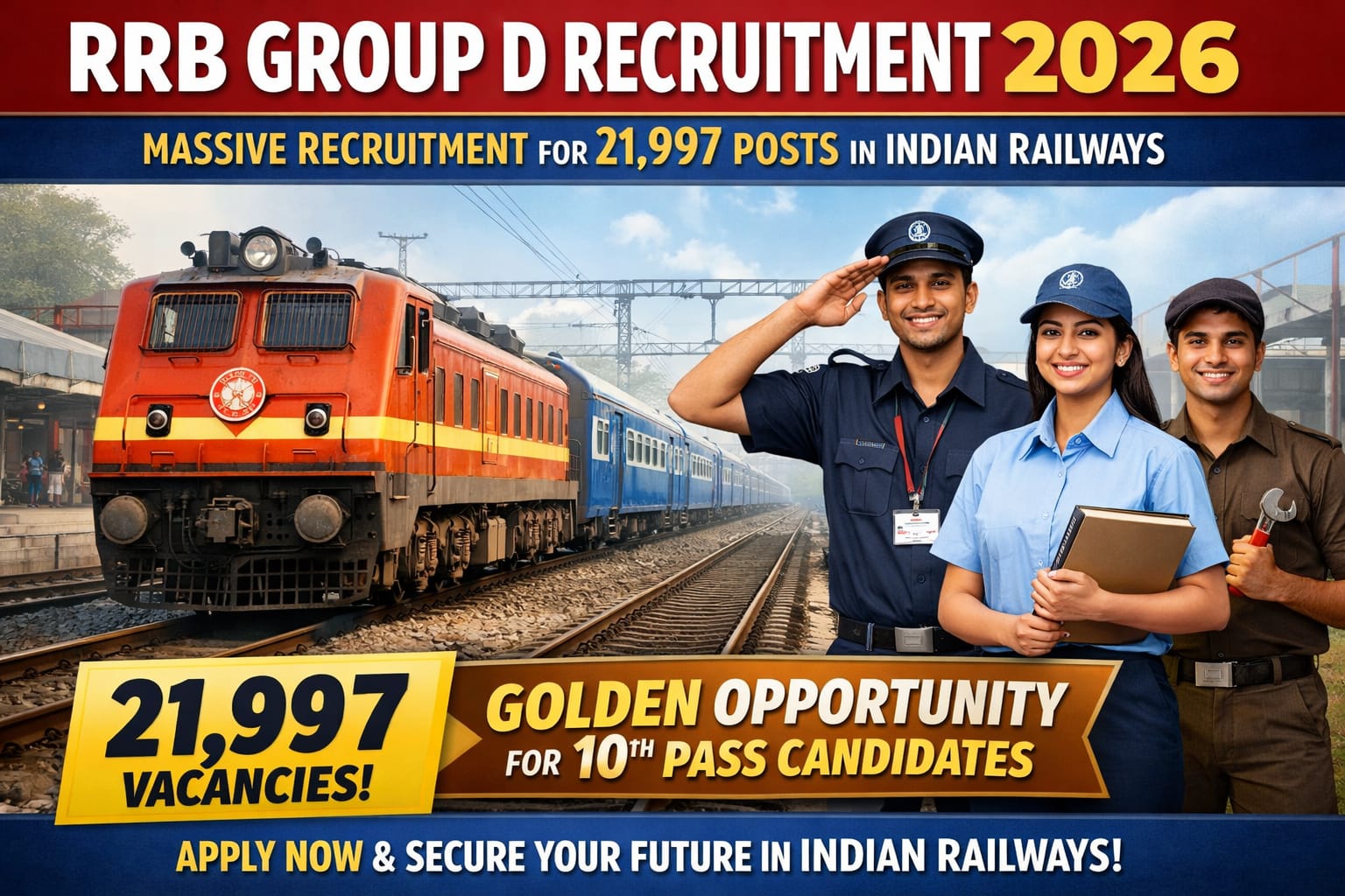 RRB Group D Recruitment 2026: ಭಾರತೀಯ ರೈಲ್ವೆಯಲ್ಲಿ 21,997 ಹುದ್ದೆಗಳ ನೇಮಕಾತಿ; 10ನೇ ಪಾಸ್ ಅಭ್ಯರ್ಥಿಗಳಿಗೆ ದೊಡ್ಡ ಅವಕಾಶ