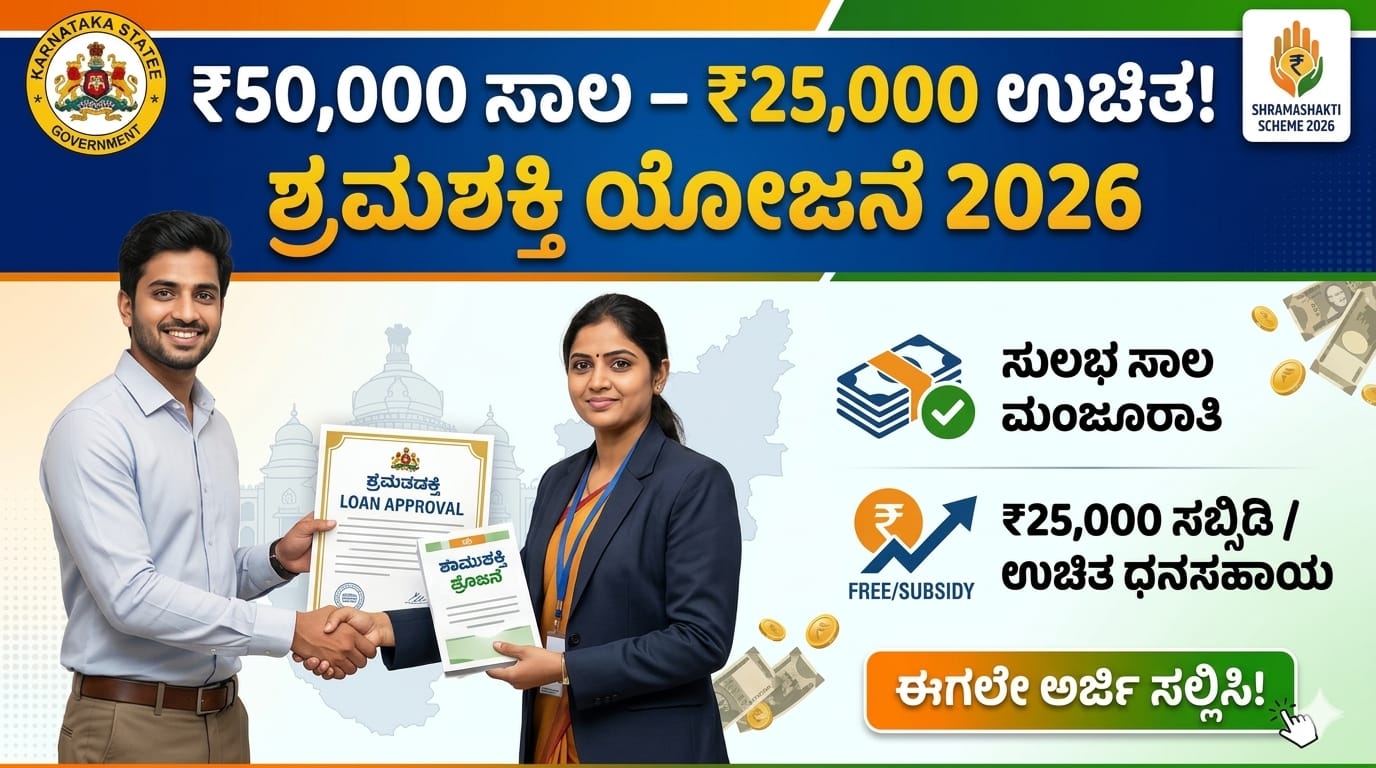 Shramashakti Loan Scheme 2026 Karnataka: ₹50,000 ಸಾಲದಲ್ಲಿ ₹25,000 subsidy, 4% ಬಡ್ಡಿ, 36 ತಿಂಗಳ ಅವಧಿ. ಅರ್ಹತೆ, ದಾಖಲೆಗಳು, online ಅರ್ಜಿ ವಿಧಾನ ಸಂಪೂರ್ಣ ಮಾಹಿತಿ ಇಲ್ಲಿ.